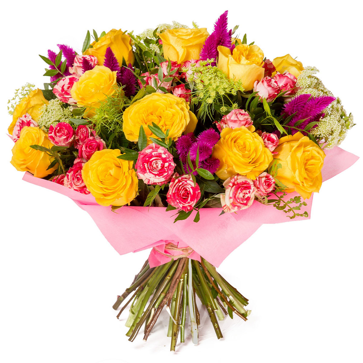 Роза одноголовая желтая, роза кустовая двухцветная, целозия, зелень. Упаковка (лента, пленка, крафт, сетка, пленка матовая)