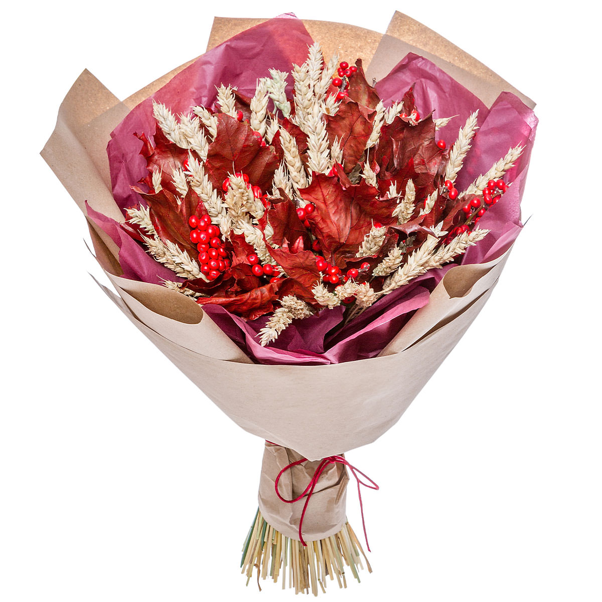 Илекс, колос, листья клена. Упаковка (лента, пленка, крафт, сетка, пленка матовая)
