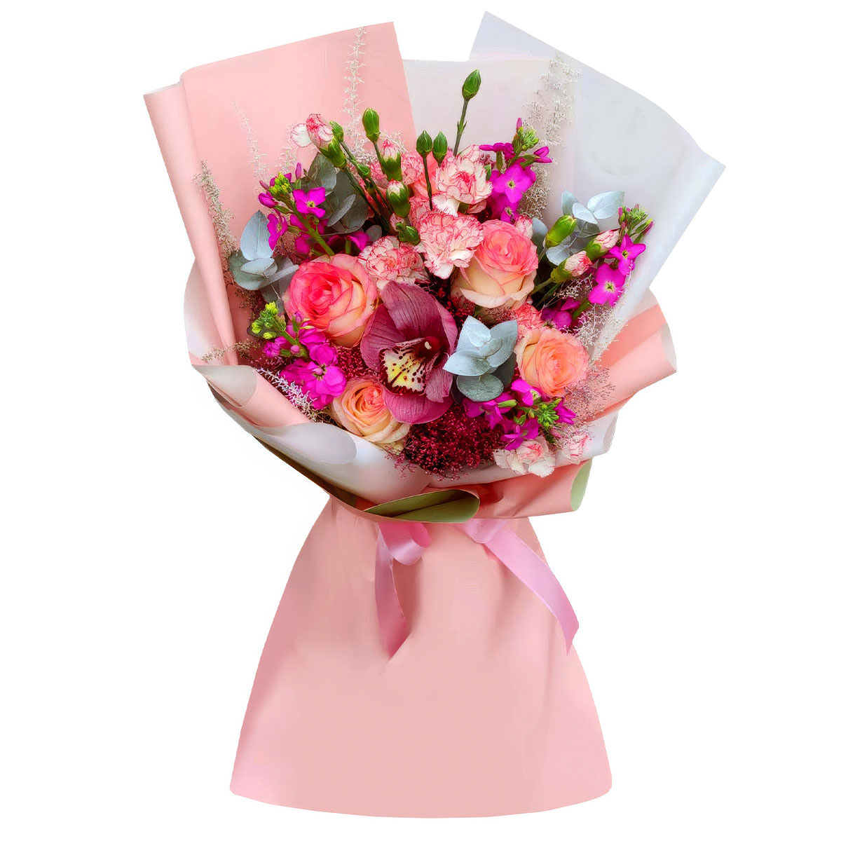 Орхидея розовая, роза одноголовая розовая, гвоздика кустовая розовая, маттиола сиреневая, эвкалипт. Упаковка (лента, пленка, крафт, сетка, пленка матовая)