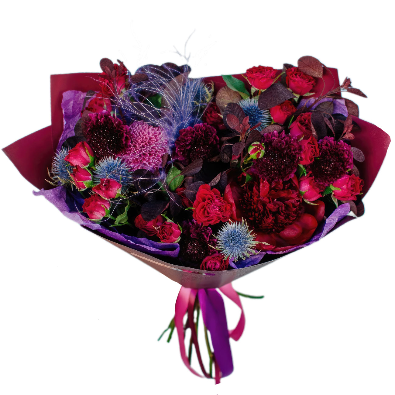 Эрингиум, роза кустовая красная, скабиоза, гвоздика бордовая, зелень, декоративные перья. Упаковка (лента, пленка, крафт, сетка, пленка матовая)