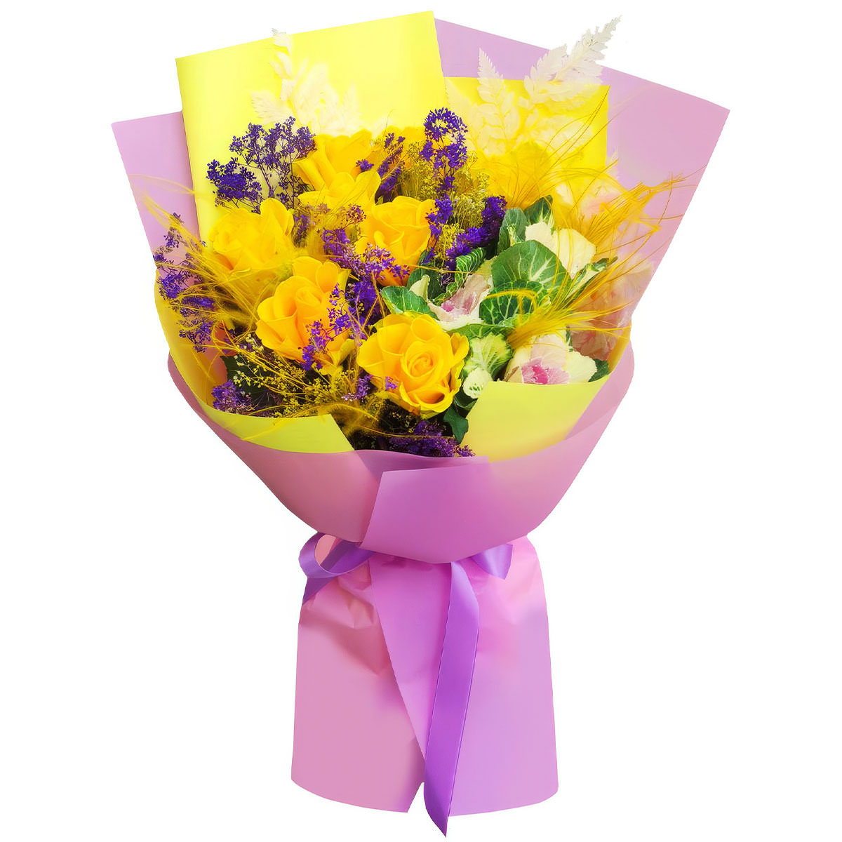 Роза одноголовая желтая, брассика, перья, сухоцветы. Упаковка (лента, пленка, крафт, сетка, пленка матовая)