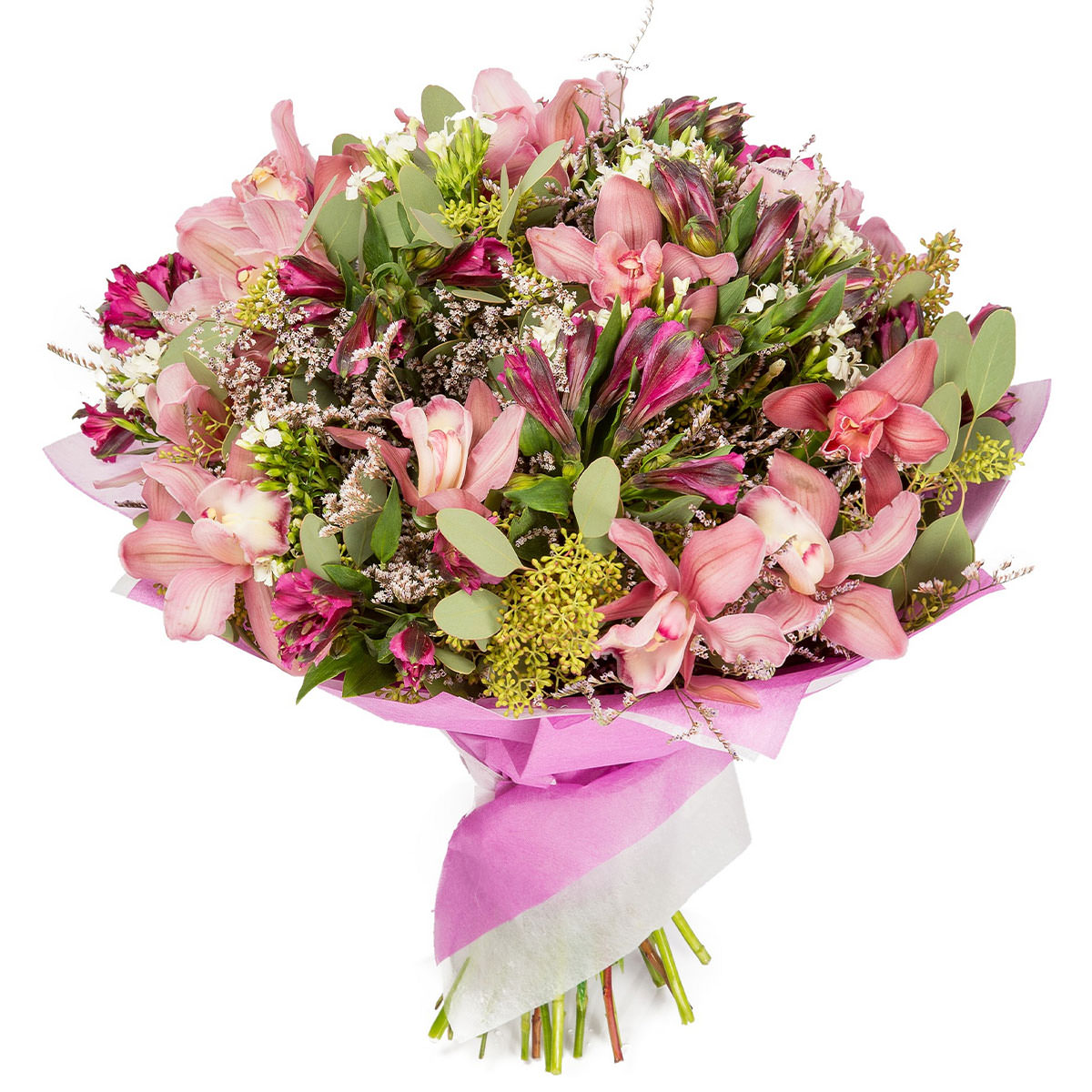 Орхидея розовая, альстромерия розовая, лимониум, зелень. Упаковка (лента, пленка, крафт, сетка, пленка матовая)