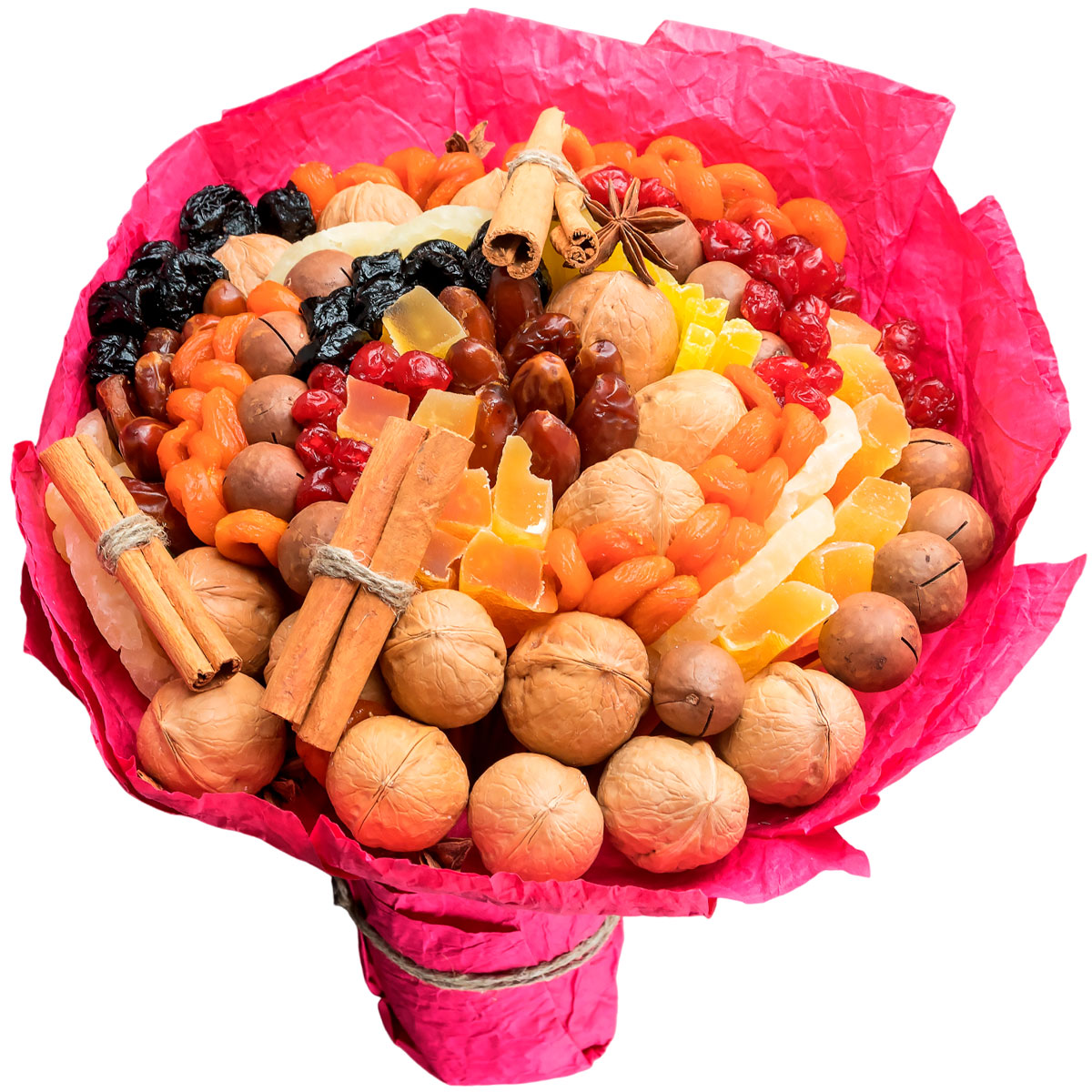 Орех грецкий, орех макадамия, финик, курага, чернослив, ананас, папайя клюква, корица. Упаковка (лента, пленка, крафт, сетка, пленка матовая)