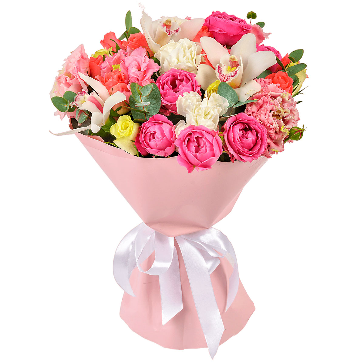 Роза пионовидная кустовая розовая, эустома белая, орхидея белая, роза кустовая, эвкалипт. Упаковка (лента, пленка, крафт, сетка, пленка матовая)