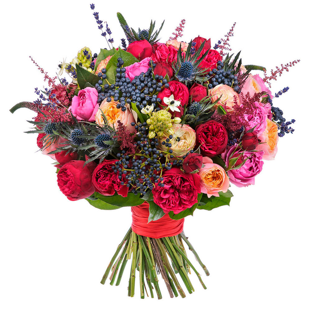 Эрингиум, роза пионовидная красная, розовая и персиковая, лаванда, астильба, вероника, орнитогалум, вибурнум. Упаковка (лента, пленка, крафт, сетка, пленка матовая)