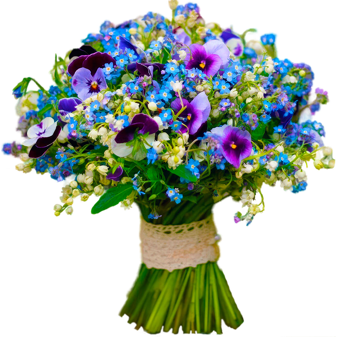 Анютины глазки, ландыши, незабудки. Упаковка (лента, пленка, крафт, сетка, пленка матовая)