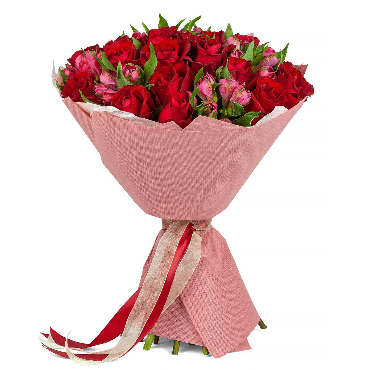 Одноголовая роза красная, альстромерия розовая. Упаковка (лента, пленка, крафт, сетка, пленка матовая)