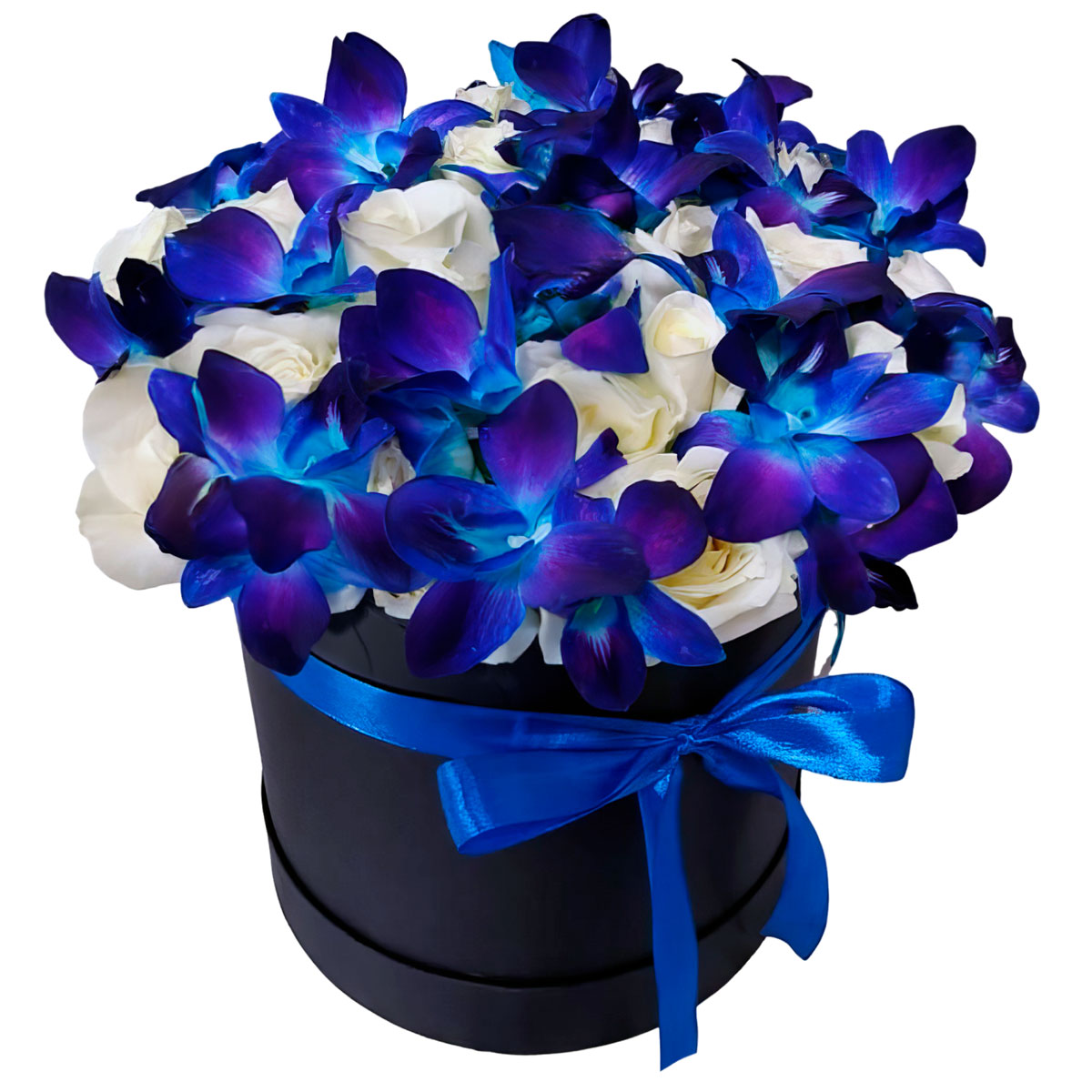 Дендробиумы синие, роза белая одноголовая. Упаковка (шляпная коробка, квадратный бокс, коробка сердце, оазис)