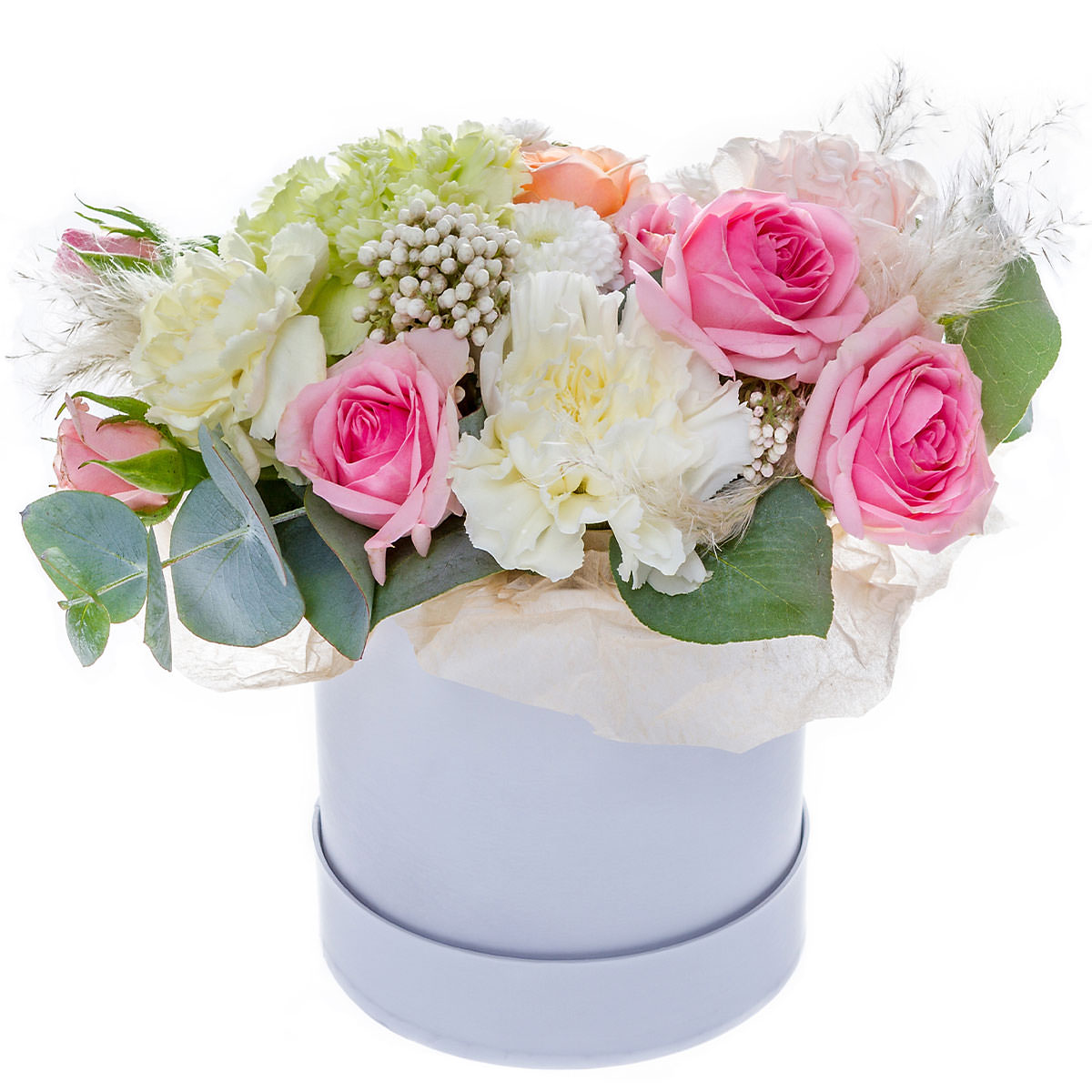 Гвоздика белая и зеленая, роза одноголовая розовая и персиковая, озотамнус, сухоцвет, эвкалипт. Упаковка (шляпная коробка, квадратный бокс, коробка сердце, оазис)
