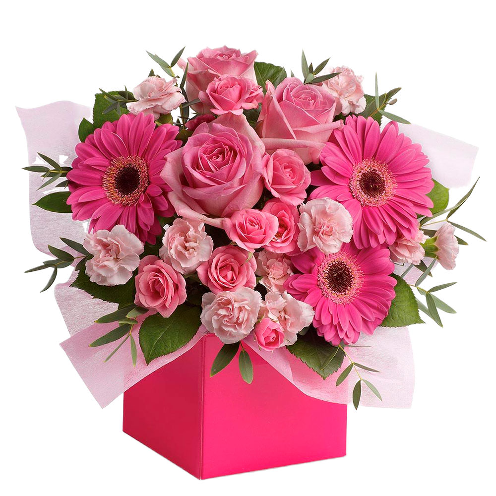 Роза одноголовая розовая, роза кустовая розовая, гербера розовая, гвоздика кустовая мини розовая, фисташка. Упаковка (шляпная коробка, квадратный бокс, коробка сердце, оазис)