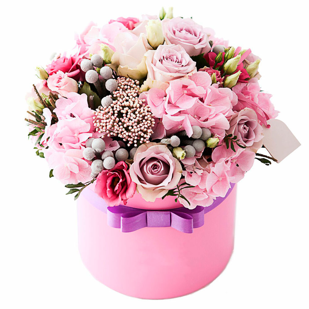 Роза одноголовая сиреневая, гортензия розовая, бруния, эустома розовая, трахелиум. Упаковка (шляпная коробка, квадратный бокс, коробка сердце, оазис)