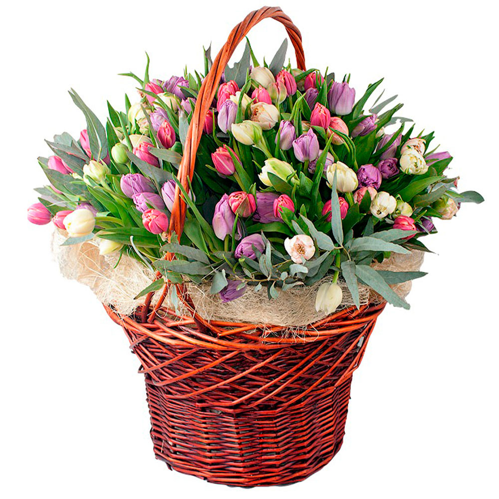 Тюльпан микс (сиреневый, розовый, белый), зелень. Упаковка (Корзина, оазис).